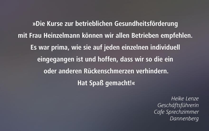Für die Region Wendland, Altmark bis Hamburg und Wolfsburg biete ich, umfangreich ausgebildete Physiotherapeutin, professionelle Beratung und Schulungen zur betrieblichen Gesundheitsförderung direkt in Ihrer Firma an. Ad hoc Infos dazu finden Sie in meinem pdf Flyer.. Gerne informiere ich Sie auch persönlich. Sie erreichen mich unter der Telefonnummer
